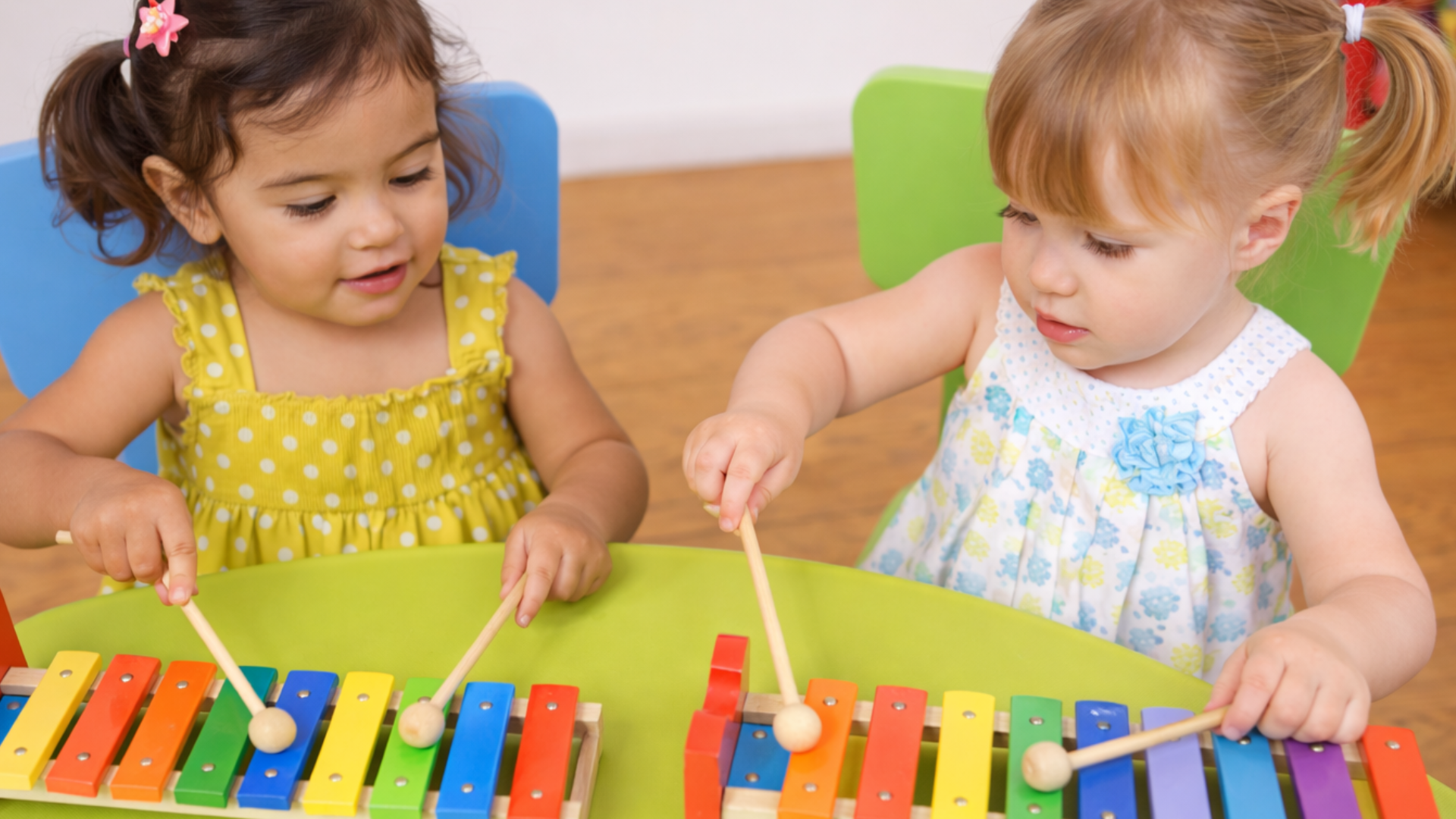 - Piano, reading music, musical games with bean bags, bells, drums and boomwhackers